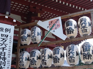 ◇鬼灯市と日曜日が重なって、動きのとれないほどの人出に汗だくで四万六千日のお参りをしました。(操) ◇とにかく暑い日、そして、四万六千日でもあり、浅草寺の境内は押すな押すなの人の波。異国からの観光客もバスで何台も来ていると、茶店の方がうれしい悲鳴を上げておられる。(千里) ◇天気もよかったせいか、すごい人出で、仲見世は日除けもなく暑かった。(享子) |