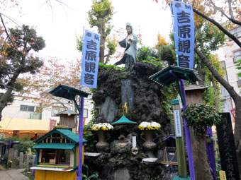 ◇熊手市は、いつも見るだけ。一度くらいは買ってみないといい句が授からないのかなと思った。(隆雄) ◇記念館を出て酉の市へ。一本裏の通りを行き、飛不動の近くから入る。飛不動からは航空関係の参拝者が多いというのがおもしろい。 酉の市の手締め「ご通行の皆様もご一緒に」と言われてその気になる。そういう人が多いためにあちこち大きな手締の声が上がるのだろう。見ていて楽しいが、しかしすごい人である。(淑子) ◇あまりにも長い行列に酉の市をあきらめ、屋台の並ぶ裏通りを歩いて、吉原観音・弁天様へ。吉原の遊女をお祀りしているところで、しばし遊女たちの昔に思いをはせた。(瓔子) |