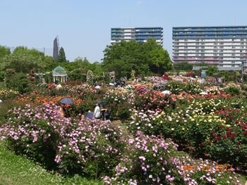 ◇園内は、一万株のバラが今を盛りに咲き競い、小径を進み奥へ行きつつ香に酔ってしまいそうであった。(千里) ◇園を奥へ進むと、風景一転、睡蓮の池が現れました。緑陰は涼しくしばらくベンチでゆっくり過ごしました。(瓔子) ◇風そよぐ見ごろの薔薇園、堪能しました。小径の曲がりよう、少しの起伏にも作り手の気遣いが思われる園でした。 緑陰のベンチに坐せば、句作りのことはしばし忘れて、居眠りしたい心地でした。(宏治) |