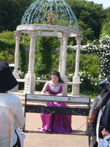◇バラの香に包まれて聞いたピアノの演奏もとてもすばらしかった。(隆雄) ◇ドアーツードア三時間半と遠かったが来て良かった。バラは壮観。バラ園のど真中の演奏はすばらしかった。(周雄) |
