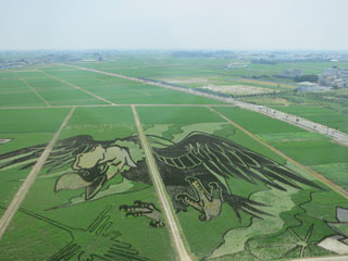 ◇早いうちにとタワーに上り、田んぼアートを見る。コンドルにナスカの地上絵のデザインは勢いもあり、思ったよりくっきりと迫力のあるものだった。エレベーター一基のみということで、非常階段は必須と思うのだが。(淑子) ◇暑い暑い中の吟行、二の足を踏む思いで参加した。でも来たかいがあって田んぼアートもくっきりと素晴らしく、コンドルとナスカの地上絵の迫力に圧倒されました。(とめ子) |
