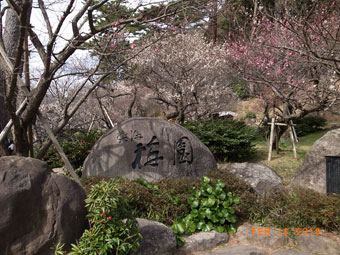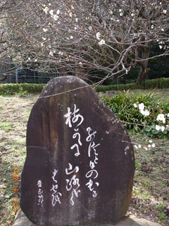 | ◇名にし負う熱海の梅林に吟旅となった。 駅は、わやわやとごった返す賑いであった。 (とめ子) ◇久々に熱海を訪ねました。駅前から直通バスで梅園へ。梅園には多くの人(外国の方も)が順路札に沿って流れてゆく様子。小道だけに都会の雑踏を思わせる様・・・でしたが、お天気にも恵まれ、良い吟行が出来ました。(千里) ◇初めて熱海梅園を訪れました。白梅紅梅ともに良い感じで混ざり合っていて見事でした。 おいしい甘酒も頂き、楽しい春の吟行でした。(恵子) | ![]() 芭蕉句碑「梅が香にのつと日の出る山路かな」 |