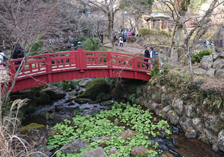 ◇白梅と紅梅のまざり具合も絶妙で、渓を流れる水音も梅祭を一層盛り立てていた。 梅の香を胸いっぱいに吸い込んだ一日だった。(隆雄) ◇川にかかる五つの橋はすべて意匠が異なり、風情のある名前がついていた。(瓔子) |