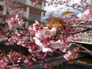 ◇晴天に恵まれ、少し歩けば汗ばむ程の陽ざしの中、宿から海岸の方へ川沿いを散策する。 折よく寒緋桜の並木が満開に、はらはらと散り初めている。濃い花弁が川中で寄り集まって流れたり溜まったりしている様に出逢え、好運でした。(千里) ◇熱海桜が思いのほか満開で、糸川沿いの道は良いお花見になりました。(恵子) ◇つづけて良いお天気に恵まれルンルン気分。これで句もルンルンといけば・・・・?? 何とか参加できる事に喜びを持ち続けていきたいです。(加容子) ◇糸川に沿う熱海桜が盛りを過ぎてなお見事。一句にと思うことしきりなれど・・・(宏治) ◇昨日は梅、今日は桜。なんと贅沢な吟行でしょう。(瓔子) |
