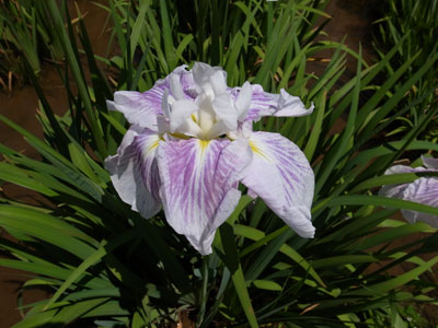◇江戸川駅を降りるとすぐ小岩菖蒲園の看板が目に入り、角を曲がると目の前が江戸川の土手。青空の下、河原に広がる色とりどりの菖蒲に目が洗われるようだった。(章子) ◇めったに乗ることのない京成線で少し不安でしたが、着いた菖蒲園は今が盛り、白と紫の菖蒲が咲き誇っていました。(とめ子) ◇広広とした河川敷の解放感、鉄橋を渡る京成電車、青々とした土手、それに真青な空。これまで見てきたどの菖蒲園とも違う味わいです。(瓔子) |