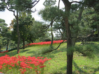 ◇祝田門から日比谷公園に入った。三笠山とか自由の鐘は初めての場所で、いつもと違った雰囲気を味わった。 銀杏が結構落ちていたが踏んで中身を調べるとやはりまだ小さかった。(享子) ◇秋薔薇がまだほとんど咲いていないのは残念だったが、曼珠沙華がちょうど見ごろ。帯をなして咲いているのが見られた。(瓔子) |