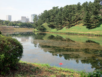 ◇天高く皇居の堀には鳰や白鳥がゆったりと遊ぶ。皇居のまわりを走る人達がいかにも心地よさそう。(宏治) ◇桜田門の曼珠沙華をたのしむつもりでしたが、数が少なくちょっと期待はずれでした。(律子) ◇桜田門濠の土手には曼珠沙華が少し盛りを過ぎたようでしたが、やはり秋彼岸だと思いました。(彰宏) ◇九段下から皇居の西半分にそって歩いた。桜田濠は藻が茂ってあまりきれいとは見えなかったが、彼岸花があり、空をよく映していた。今は土橋で区切られているが、昔から土橋だったのは半蔵門だけとか。半蔵門に立っているとおりしも皇居から数台の車が出て行った。それぞれ別方面に走っていったのは、どうしてか解せず。(淑子) |