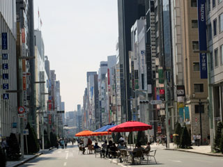 ◇日比谷公園がら会場の京橋へ行く途中、銀座通りは歩行者天国で道の中央の赤と紺の傘のカフェテラスでコーヒーを飲む人を横目に会場へ急ぎました。(操) ◇会場まで銀ブラでもと思いましたが、時間の都合でタクシーで直行しました。少々残念でした。 (律子) |