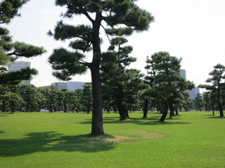 ◇桜田門から皇居前広場に出る。手入れの行き届いた芝生に形のよい松が並ぶ。(好子) ◇楠木正成像の近くにバスの駐車場があり、観光バスが次々と来る。ツアー客がぞろぞろと列をなして歩いて行き、ほとんどが外国人のように見えた。(瓔子) ◇それにしても皇居前広場は広いです。松の姿と相俟って日本のシンボルと思いました。 (律子) |