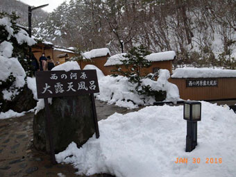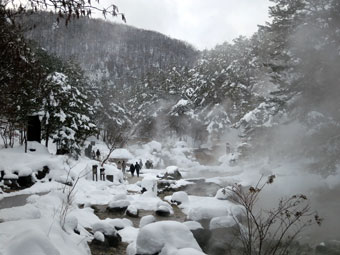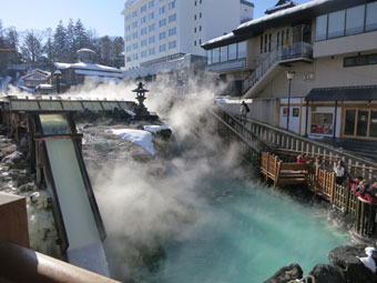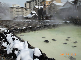 ◇ホテルに荷物を置いて、いざ散策。まず立ち寄った西の河原露天風呂。雪の積もる中寒いかと二の足を踏んだが、皆で入ると最高の気分。さすがに日本一の草津の湯を実感した。(章子) ◇露天湯に入りたかったが、湯ざめを恐れて取りやめたことが心残り。(隆雄) |