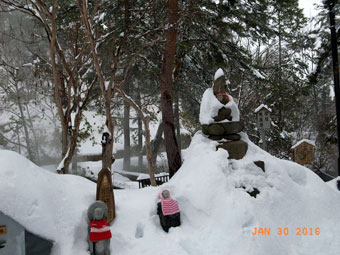 ◇西の河原公園にはベルツ・スクリッパ像が雪に埋もれるようにして立っていた。お地蔵様も雪の中。(瓔子) ◇西の河原の湯の川を見て草津温泉の湯量の豊富さに改めて驚いた。(周雄) |