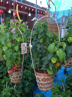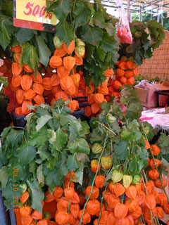 ◇鬼灯市の客ににぎわう浅草、久しぶりでしたが、見ごたえがありました。浅草は、青いほおずきを売ると教わりました。竹の籠入りで吊って売られていて、とても目に涼しく感じました。でも鉢の数ほどには売れていないよに見受けられました。外人客が多いからかもしれませんが。(章子) ◇鬼灯市は、買うでもなく、ただ見て回るだけ。法被姿の娘さんが写真家の人気を集めていた。(隆雄) ◇鬼灯の鉢は2500円と放送していて、抜けがけはないようにしているらしかった。それでも「安くするよ」という声も聞こえてくる。(淑子) |