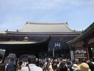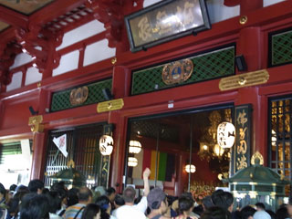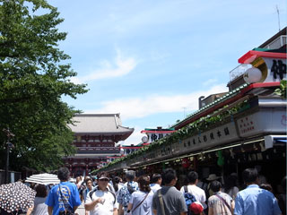 ◇鬼灯市と日曜日が重なって、動きのとれないほどの人出に汗だくで四万六千日のお参りをしました。(操) ◇とにかく暑い日、そして、四万六千日でもあり、浅草寺の境内は押すな押すなの人の波。異国からの観光客もバスで何台も来ていると、茶店の方がうれしい悲鳴を上げておられる。(千里) ◇天気もよかったせいか、すごい人出で、仲見世は日除けもなく暑かった。(享子) |