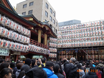 ◇大変な人出に只おどろきました。遥拝も出来ず、横丁から手締めの音くらいはと割り込みました。考えてみたら、祭日と重なった酉の市だったんですね。(律子) ◇久しぶりの酉の市、祭日とあって、人・人・人の坩堝。十重二十重とはこの事。人によ酔ってしまった酉の市でした。神社には到底たどりつけず門前で人の流れを見ていた。(好子) ◇とにもかくにも人の多いこと。波にもまれて待合場所へなかなかたどり着かず・・・そちこちに威勢の良い手締めがして千客万来のようでした。(とめ子) ◇ものすごい人出に驚いた。本殿の近くで遠拝みするのがやっとだった。(隆雄) |
