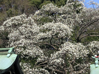 ◇このような住宅街にこんな大きな神社があるのに驚いた。御鎮座九百五十年と云う古さもすごい。もっとも昔は何もない武蔵野の真只中だったのかもしれない。(周雄) ◇参道を歩きながら、神門の前の真白な辛夷に目を引かれました。(操) ◇辛夷の大木が満開というので近づくとメンバーがなんとはなしに集まっている。青畝先生の句碑にご挨拶する。(淑子) ◇社殿では一組の新郎新婦が式を挙げており、ほのぼのとした春の気分が、又一段と楽しくなりました。(隆雄) ◇本殿の入口に激動の時代に在位中の昭和天皇の御詠歌があった。「天地の神にぞいのる朝なぎの海のごとくに波たたぬ世を」しみじみと先帝の気持ちに思いを馳せた。 辛夷、彼岸桜、雪柳、沈丁花が満開で、陽春を十分に楽しめた。(享子) ◇社殿前にお式を挙げたばかりらしい花嫁の姿も白い花嫁衣裳に白い髪飾りが、境内に満開の辛夷を連想させて清々しい。(千里) |