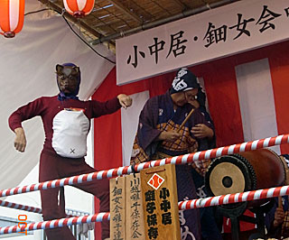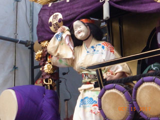 ◇山車は雨除けされ、屋根が見えないのが多く残念で、ひょっとこやおたふく、狐などの面をつけた踊りがおもしろかった。(淑子) ◇山車の踊りはどれもうまく、素晴らしかった。山車の引き回しがある時にぜひもう一度来てみたいものだ。(周雄) |