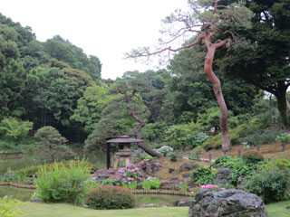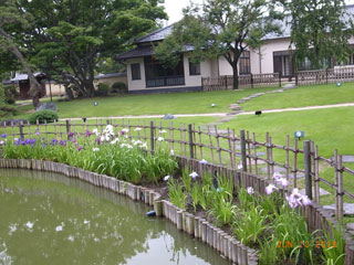 ◇細川藩の下屋敷跡という木立の茂りはさすがと眺めました。(操) ◇人の少ない日本庭園、雨ならではの静けさでした。 (千里) ◇肥後の大名庭園の菖蒲は、沢山集まっているいわゆる菖蒲田と違い、各々が池に面し、姿よく見え、風流であった。(享子) |
