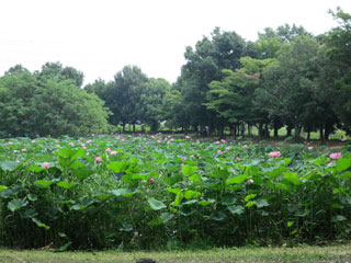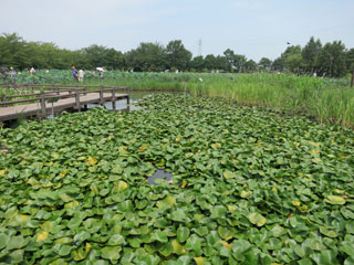 ◇古代蓮(行田蓮)がいくつかの池で満開。とにかく暑いので木陰になるベンチからベンチ、四阿とつたって動く。蓮の風は心地よい。(淑子) ◇水生植物園では、蓮の他にアサザや睡蓮も見られました。木道は陰がなくて暑かったですが、珍しい蜻蛉や大きなオタマジャクシも観察できました。(瓔子) |