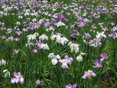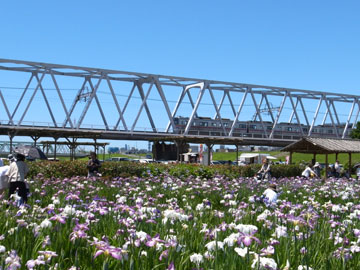 ◇江戸川駅を降りるとすぐ小岩菖蒲園の看板が目に入り、角を曲がると目の前が江戸川の土手。青空の下、河原に広がる色とりどりの菖蒲に目が洗われるようだった。(章子) ◇めったに乗ることのない京成線で少し不安でしたが、着いた菖蒲園は今が盛り、白と紫の菖蒲が咲き誇っていました。(とめ子) ◇広広とした河川敷の解放感、鉄橋を渡る京成電車、青々とした土手、それに真青な空。これまで見てきたどの菖蒲園とも違う味わいです。(瓔子) |