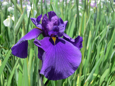 ◇昨夜の雨もすっかり上がり、梅雨の晴れ間の太陽が嬉しい。菖蒲にかこまれ、”精”になった気分で廻りました。(加容子) ◇花菖蒲は満開、紫と白のグラデーションがすばらしい。しかし、句にはなかなか詠みきれず苦吟するばかり。(隆雄) ◇菖蒲を囲むように四阿が配してあり、ゆったりと落ち着けました。江戸川の風が心地よかったです。(章子) ◇園内の手入れ作業の方のお話しでは、菖蒲の花は三日の命とか。花の間引きが悲しい。(千里) ◇江戸川の豊かな水を引く菖蒲は生き生きとして元気を戴きました。(昌子) |