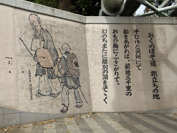 ◇芭蕉が舟から降り立ったのが南か北か地元では議論がある由(周雄) ◇素戔嗚神社から少し歩くと千住大橋と聞いて向かいました。芭蕉の旅周り等社会勉強し、暑さの中でもよい思い出になりました。(三重子) ◇千住大橋からの眺めは芭蕉のころと変わっているのだろうが、川の流れは今も同じだと思った。(隆雄) ◇秋の日射しの強い千住大橋を渡り、久しぶりに墨堤に下り、秋風に休憩しました。隅田川はまだ澄むとまでは云えない流れで釣人も皆無でした。(操) ◇千住大橋が家康のころからあったということに驚く。大きな川に橋を架けるか架けないか、政治的な背景があったのだなと再認識した。 それにしても、貼られていた川番付、橋番付を眺めては、日本人はランキング好きなのだなと思った。(淑子) |