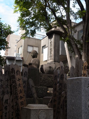 ◇投込寺の遊女の碑を初めて見たが、何とも云えない淋しい気持、荷風の碑も立派だったが、なんだか少しそぐわない気もした。(隆雄) ◇浄閑寺等、東京のお寺の墓地の狭いこと、ぎっしりと墓石が並んでいることに驚く。吉原の遊女の塚には花とともにアクセサリが供えられていた。(淑子) ◇初めての投げ込み寺、そぞろ寒い思いで入ったが、そんな感じはしなかった。都会の墓苑とてぎっしりと所狭しとお墓が並んでいた。昔昔はどんなだったかと思いをはせてみる。遊女の墓と無縁墓とねんごろにお参りした。思いの外暑い日であった。(とめ子) ◇浄閑寺(投込寺)はその異名からややこわごわでしたが、無縁仏を祀る塔も大きく立派に正面に据えられていて、昔遊女達を懇ろに祀った優しい寺の伝統が感じられました。(千里) |