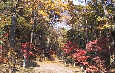 ◇広い境内が素晴らしい紅葉でした。武蔵野の昔はすべてこんな雑木林だったのでしょう。落ちている葉を見てこれは栗、これは桜と言って歩くのも楽しい。どんぐりの実が沢山落ちていて拾おうとすると根が付いているものもありました。こうやって雑木林は維持されていくのかなと実感できました。(淑子) ◇広大な武蔵野の雑木林は今を最後の紅葉中。初冬を肌に感じつつ歩きながらにメモをとりました。時間が少し足りないなと思いました。(信行) |
