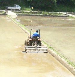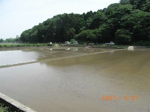 ◇バスを降りると、目の前に田圃、植田あり青田あり代田ありまだ田起こしすらしていない田圃ありと、まるで田圃の展示場のようだった。(隆雄) ◇谷戸の奥まで農地の区画整理が終わって広々とした田での田植えの最中の感じだが、代掻き機、田植え機が活躍中で、農家の数は以外に少なそう。何人も一列に並んでした田植えの光景が懐かしい。(辰也) |