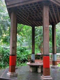 ◇吟行の途中、蛇を見て喜んでいる自分に、俳人になったものだと驚く。(宏治) ◇雨の中、句帳を広げることもできないので、四阿で雨を避けようと思ったが、猫が陣取っていた。じっと動かず、こちらをにらむので退散。(瓔子) |