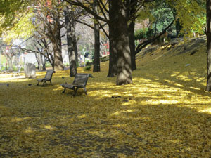 ◇地下鉄を出たとたん歩道いっぱいに散り敷く銀杏落葉に目を奪われた。東照宮、芝公園、古墳と大きな銀杏の紅葉はすばらしい光景でした。(操) |