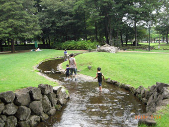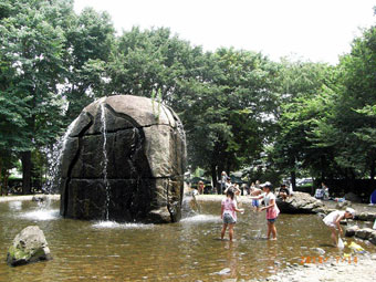 ◇緑陰の涼しさは格別。子供達が、水浴びやせせらぎ遊びで楽しく走り回っていたのが印象的であった。(隆雄) ◇関東のへそと云う公園は、緑が豊富で水も多く、子供達はびしょ濡れで水遊びに興じていた。(周雄) ◇巨石から水が吹き出る遊び場、小さな水場、せせらぎ、子供達にとっては楽しくて仕方がない場所だろう。帰りたくないとぐずる小さな子も、水を怖がる子も、さまざま。(淑子) |