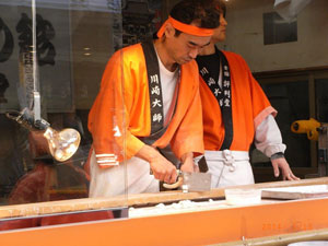 ◇初めての川崎大師に感激し、飴切のリズムに調子良く歩いて進む参道でした。人も多く、迷いそうな所でしたが良い一日でした。(三重子) ◇屋台も多くて驚き、飴切る音もリズミカルに聞こえてきました。(加容子) |