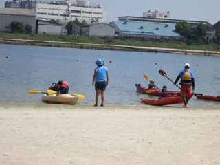 ◇海苔作りの貴重な資料を見学できて有難かった。船や道具類は今までみたことのないものばかりで珍しかった。 季節ごとの漁民の着衣も珍しく、破れたり繕われたりしたものには当時の苦労が偲ばれた。(柳影) ◇展望台がら見ると箱庭のような公園と浜辺だったが、浜辺に行ってみると風が心地よく、白い砂浜が広がって見える。波がほぼないのは残念だが子供達が遊ぶにはよさそうだ。(淑子) |
