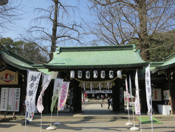 ◇このような住宅街にこんな大きな神社があるのに驚いた。御鎮座九百五十年と云う古さもすごい。もっとも昔は何もない武蔵野の真只中だったのかもしれない。(周雄) ◇参道を歩きながら、神門の前の真白な辛夷に目を引かれました。(操) ◇辛夷の大木が満開というので近づくとメンバーがなんとはなしに集まっている。青畝先生の句碑にご挨拶する。(淑子) ◇社殿では一組の新郎新婦が式を挙げており、ほのぼのとした春の気分が、又一段と楽しくなりました。(隆雄) ◇本殿の入口に激動の時代に在位中の昭和天皇の御詠歌があった。「天地の神にぞいのる朝なぎの海のごとくに波たたぬ世を」しみじみと先帝の気持ちに思いを馳せた。 辛夷、彼岸桜、雪柳、沈丁花が満開で、陽春を十分に楽しめた。(享子) ◇社殿前にお式を挙げたばかりらしい花嫁の姿も白い花嫁衣裳に白い髪飾りが、境内に満開の辛夷を連想させて清々しい。(千里) |