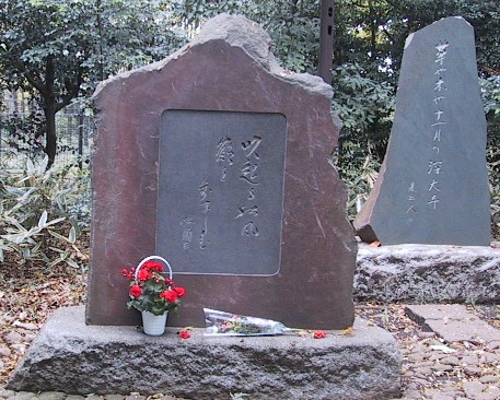 | ◇開山堂の脇にある波郷の師弟句碑. 「吹起る秋風鶴を歩ましむ」 この右奥にタイムカプセルが埋められている(辰也) |