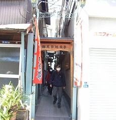 ◇横丁の奥にある佃天台地蔵尊と向う三軒両隣を覆う大銀杏には驚いた。一見は百聞にしかずで説明するのは困難。(周雄) ◇洗濯機の置いてある小路というより、軒下をいちょうの木に屋根をつらぬかれた天台地蔵堂、軒伝いの方に驚く。(智) ◇狭い路地の中ほどに佃天台地蔵のお堂があって、大きな銀杏の幹が室内にむき出しになっているのに驚いた。外へ出て見上げると確かに銀杏の大木であった。(斉) |