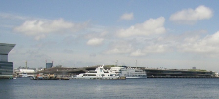 ◇大桟橋には残念ながら巨船が来ていなかった。時間が経つにつれて海の色が青くなってきた。やはり、海を見るときは快晴が一番。(隆雄) ◇大きな船がついていなかったのは残念だったが反面人も全く少なくゆっくり港の光景が楽しめた。(周雄) ◇大桟橋は板敷きであることに驚きました。大きな船のデッキのようです。端まで歩いてみようと思ったのですが、あまりに遠くて暑くてほんの入り口のベンチに腰掛けてしばらく海を見ていました。(瓔子) ◇大桟橋は大きな船はいなかったが、板張りの屋上には心地よい風があった。(辰也) |