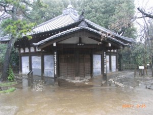 ◇六賢台は、東洋六賢人として、聖徳太子、菅原道真、荘子、朱子、竜樹、迦昆羅を祀っている ◇明治の哲学者の時空をさまよった感があったが、同時に俳句の世界に通じる何かがあるとも思った。(隆雄) ◇堅い名前の建物や場所が散在する中、初音を聞き、芽柳の垂れているのを見てほっとした。公園内はどこも水たまりと泥で歩くには困難をきわめる(淑子) |