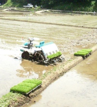 ◇大学生や市民の体験学習の手植えに加えて、田植え機も二丁掛け、四丁掛けがあるなど田植えをいろいろ見ることが出来た。農家の人の話によると例年より三日ほど早く田植えをしたとのこと。早苗の色がいつもより少し薄いといっていた。銘柄は「ひとめぼれ」(斉) ◇田植え機を運転しているのは、若い人だった。年配の人が付きっ切りで指導しており、時々注意の声が飛ぶのもほほえましかった。簡単そうにみえるが、まっすぐに植えるのは案外難しいのかもしれない。早苗の四角いかたまりがとても美しかった。(瓔子) |