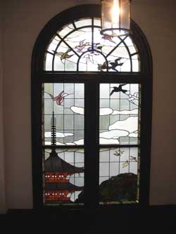 ![]() 鳩山会館、踊り場のステンドグラス |