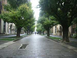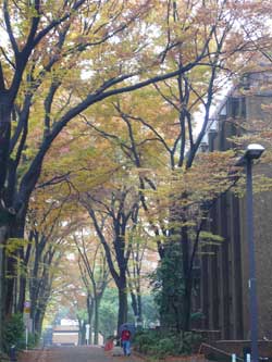 ◇古く重厚な校舎が印象的だった。学生はやはりいまどきのと思われる若者が多かった。将来の日本を担って下さいと祈る思いだった。(なぎさ) ◇キャンパスの殆どの建物が最近の真四角の鉄筋コンクリ−トでなく落ち着いた黄褐色のタイル張りで通路の天井がゴシック風(?)なのもすばらしい。(周雄) |