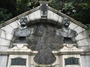 | ◇医学部を歩いていると運良くベルツ・スクリッパ両先生の像に巡り合った。〈ベルツ・スクリッパ並びて日脚伸びにけり〉は青畝先生の御句。二人仲良く並んでいた。(隆雄) |