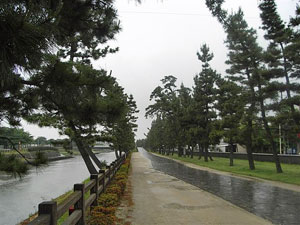 ◇あいにくの雨の草加でしたが、芭蕉が出立した日はどんな天気だったかしらと思いながらの吟行でした。長々と続く遊歩道がとぎれることのない見事な松並木でした。矢立橋、百代橋としうのが川を渡る橋ではなく歩道橋とは思いませんでした。(操) ◇振り分け荷の姿で一歩一歩この松並木の下を芭蕉が歩いていたかと思うと昔が今に忽然と現れてくるような気がする。松のみどりにはそんな魔法があるような気もしてくる。ひどい降りではなかったので雨の中の吟行も楽しかった。(とめ子) ◇綾瀬川沿いの松原遊歩道は小奇麗に整備され、緑立つ松が綺麗。(辰也) |