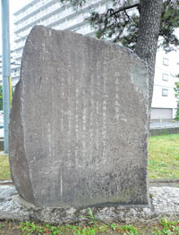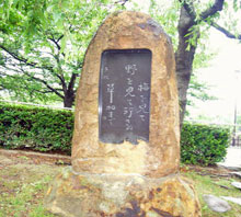 ◇「奥の細道」の草加の章段が刻まれた石碑。「其日漸 草加という宿にたどり着きにけり・・・」 ◇芭蕉の旅立ちを売り物にしている割に、句碑が子規と秋桜子の二つだけは淋しい。(辰也) |