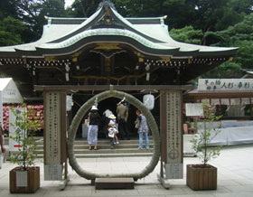 ◇有料のエスタレーターで江島神社に上り、辺津宮、中津宮、奥津宮の三つのお社にお参りしました。辺津宮に茅の輪がたっており、説明書きの通りにくぐってみました。(瓔子) ◇裸弁天に久しぶりにお目にかかった。美しい白い肌が目に付いた。(隆雄) ◇日曜のせいかお参りの人より海水浴客のほうが多いようでした。下の賑わいに比べると江ノ島神社の方は閑のようでした。(辰也) |