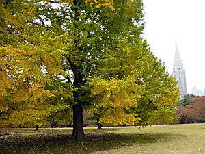 ◇よく手入れの行き届いた庭園の吟行は、相当にむずかしい。しかし、池の鴨、さわぐ寒鴉、紅葉した木々、枯芝の広場など時間をかけてゆっくり吟行したかった。(隆雄) ◇日本庭園を歩いてきて、広い芝生に出ました。大きな銀杏の黄葉、その向こうに高層ビル。西洋風の景色が素敵でした。(瓔子) |