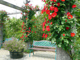 ◇ベンチはみな日当たりがよく、バラは美しいがとても暑かった。隣にはイングリッシュガーデン。ほかに広い四季の花畑と菖蒲園、睡蓮の池など見どころがいっぱい。(瓔子) |