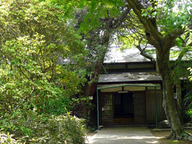 ◇ポニー牧場の先に、旧花野井住宅がある。薫蒸の匂いもよく、訪れる人も少なくて、とても落ち着いた気分になれた。(瓔子) ◇午後より雨という予報にぴったり・・・食事が済む頃には、降り始めとなった。会場の座敷の窓には、万緑の葉がそよぎ、二十畳の部屋は少々薄暗いながら、気持ち良く過ごすことが出来た。(とめ子) |