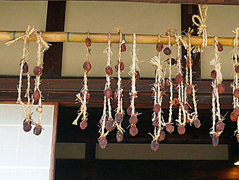 すだれ柿不作の年と言ひながら 阿波野青畝 甘干の持つ蔕に糖なかりけり 阿波野青畝 南縁の窓すきまなく柿吊す 小路紫峽
